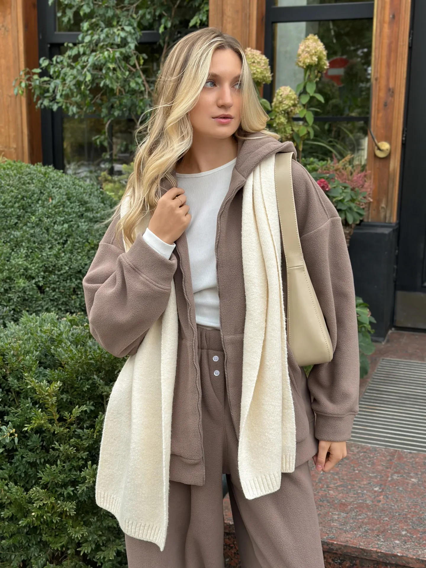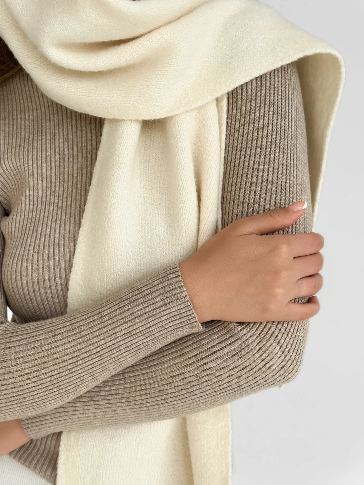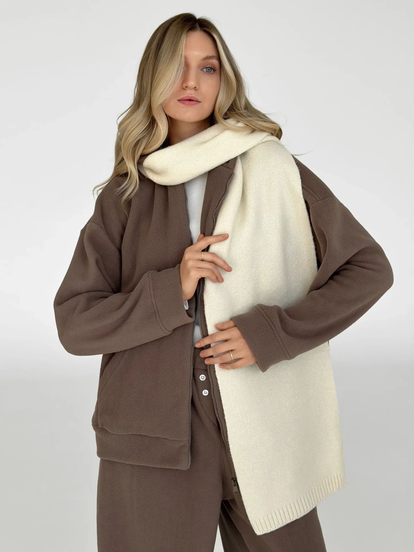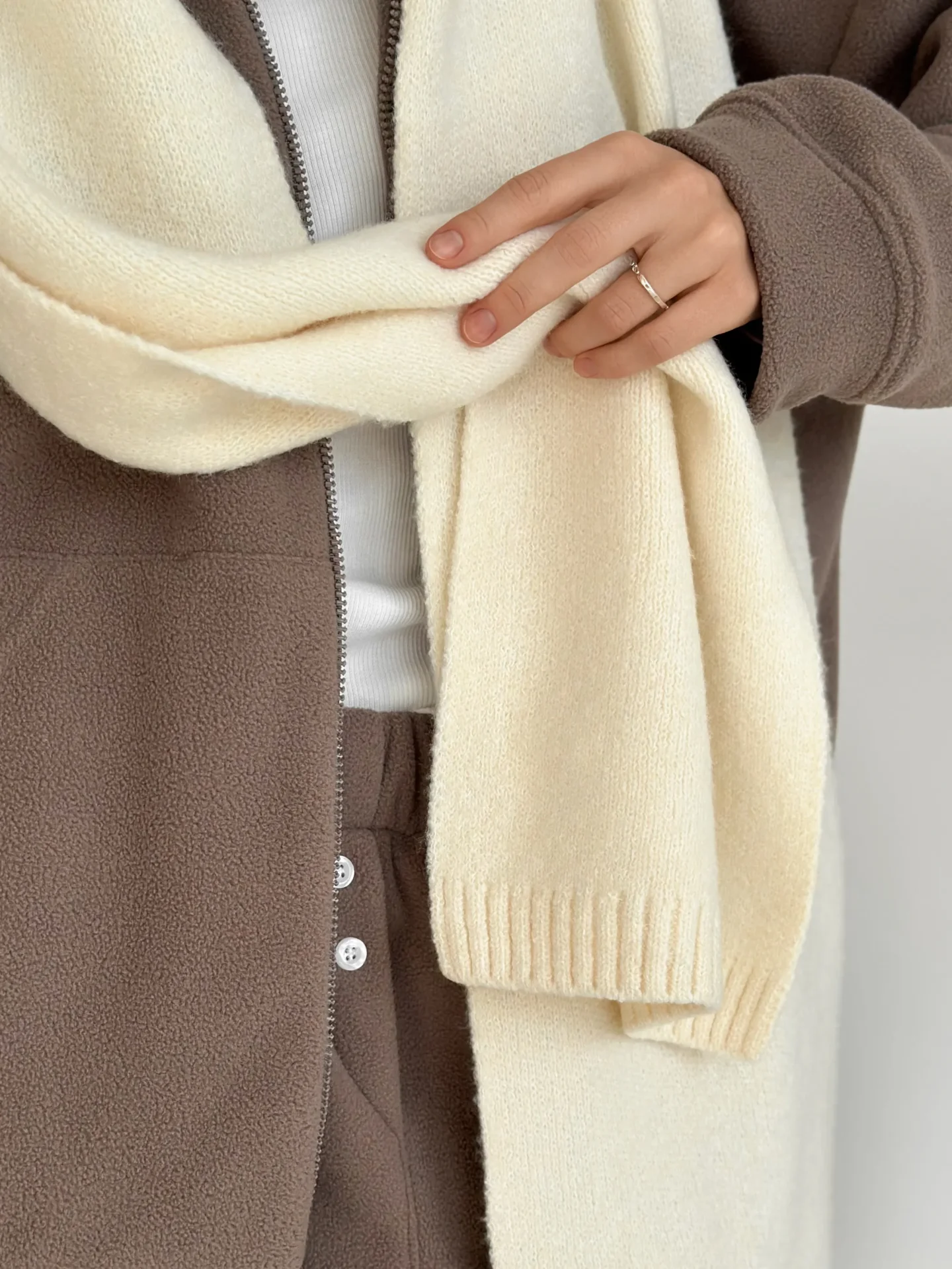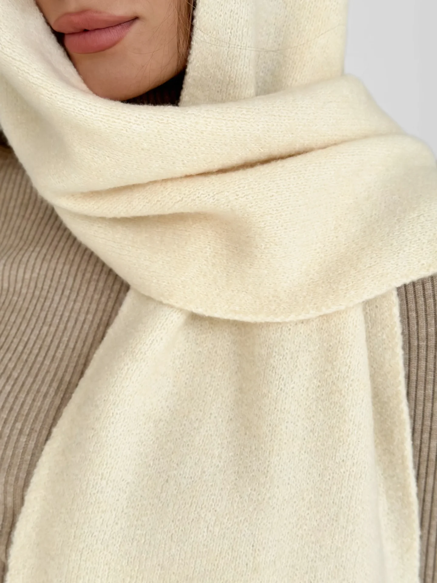 Szal wykonany z miękkiej, puszystej włóczki zapewnia uczucie ciepła i przytulności. Starannie wykonany splot i stonowane odcienie dodają elegancji każdej stylizacji. Idealny dodatek na zimowy sezon — doskonale pasuje do płaszcza, puchowej kurtki czy swetra.