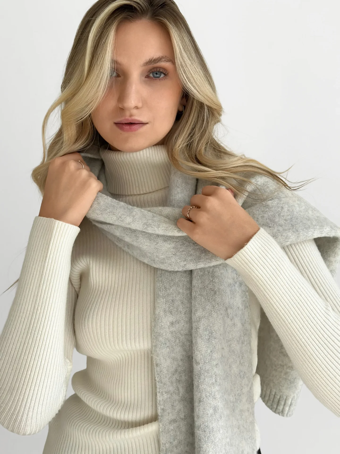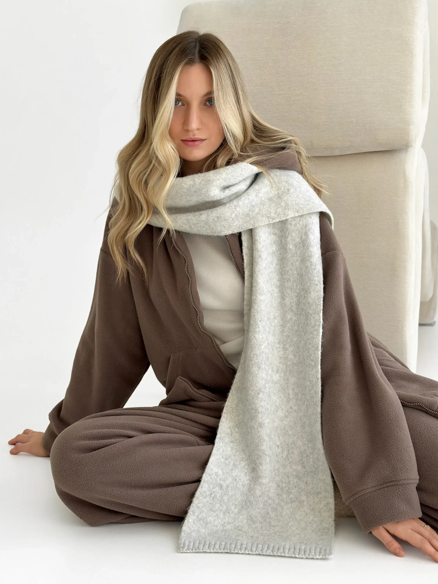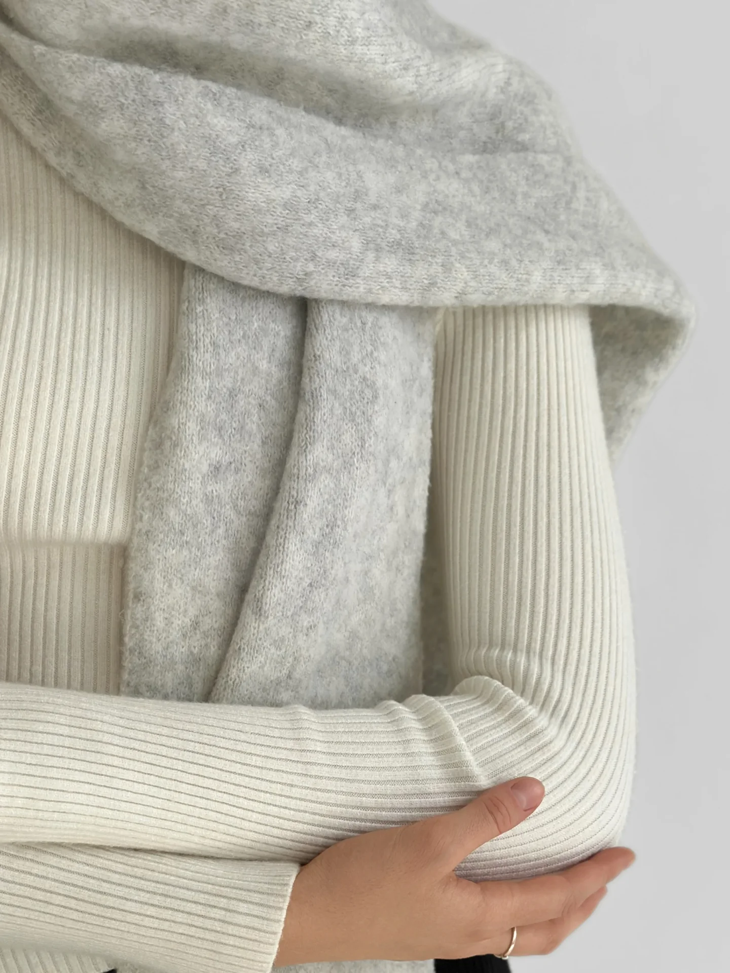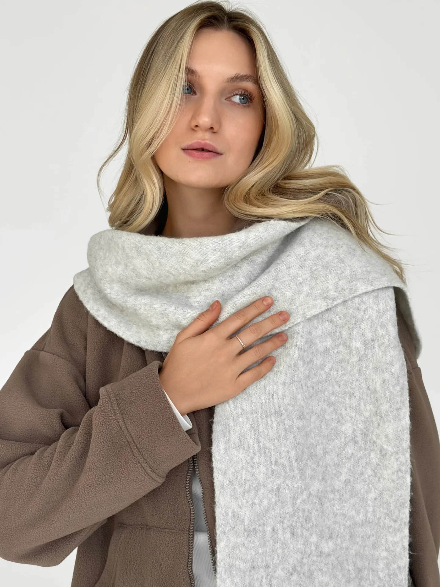 Szal wykonany z miękkiej, puszystej włóczki zapewnia uczucie ciepła i przytulności. Starannie wykonany splot i stonowane odcienie dodają elegancji każdej stylizacji. Idealny dodatek na zimowy sezon — doskonale pasuje do płaszcza, puchowej kurtki czy swetra.