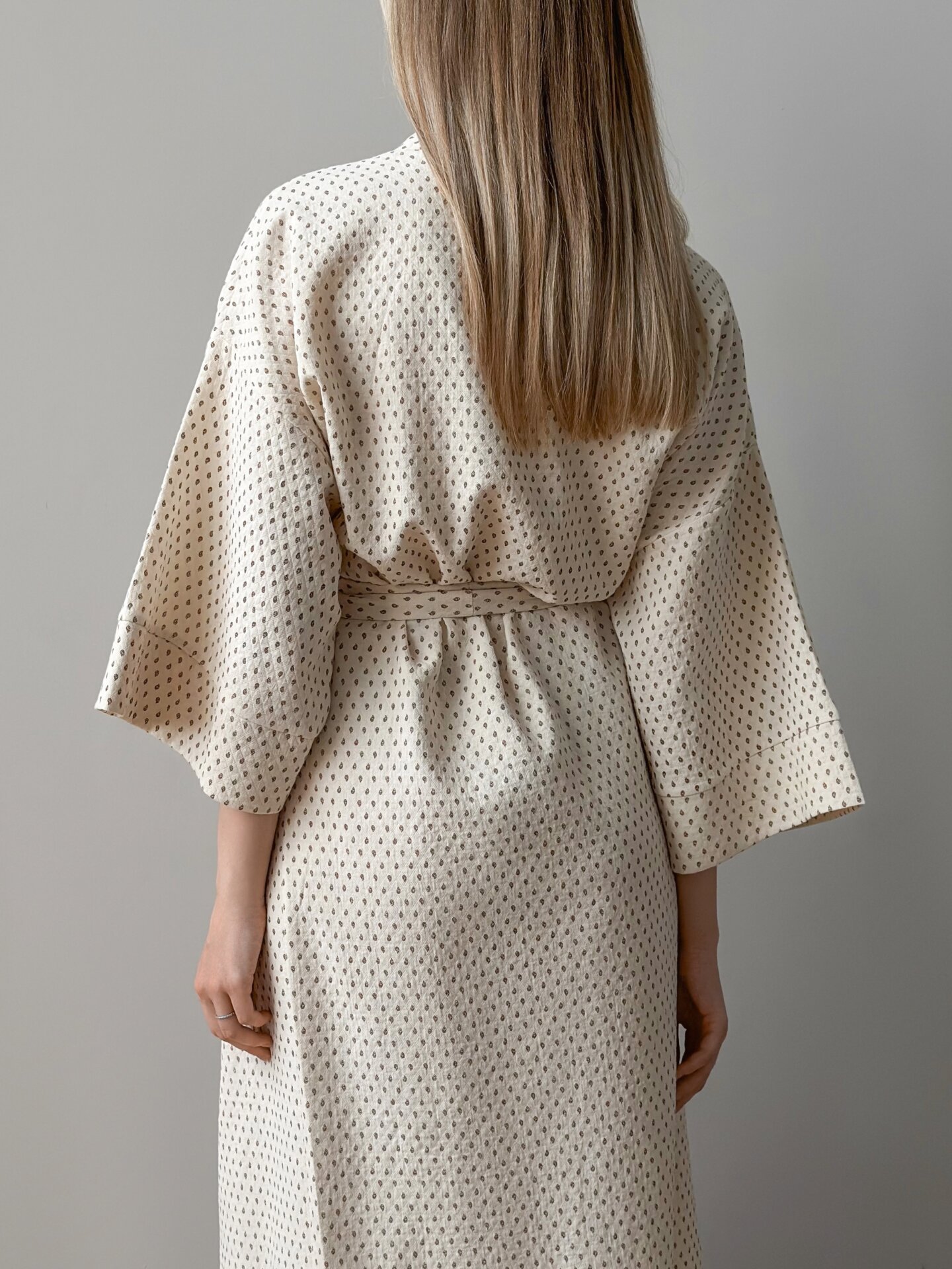 Długi szlafrok kimono z pikowanej bawełny łączy lekkość, komfort i wyrazisty fason. Naturalna, cienka bawełna o pikowanej strukturze jest przyjemna w dotyku i pozwala skórze oddychać. Luźny krój w stylu kimono tworzy swobodny wygląd, a pasek podkreśla talię. Idealny wybór do domu i na wypoczynek.