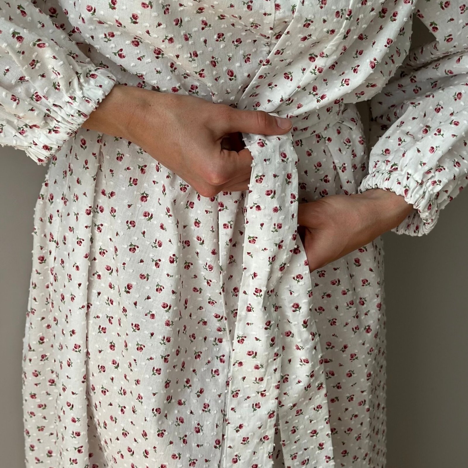 Szlafrok długi z batystu, biały w kropki i czerwone róże