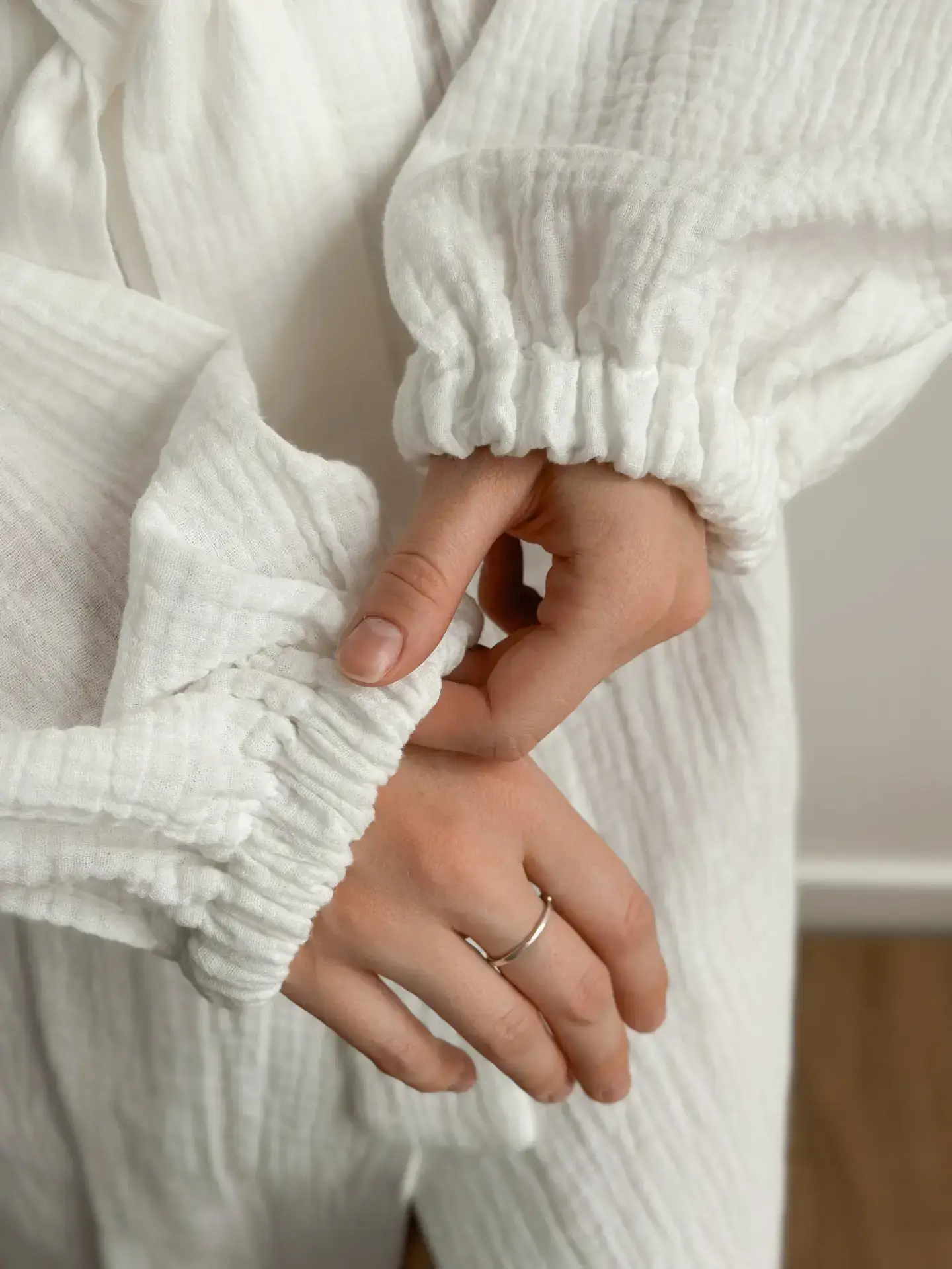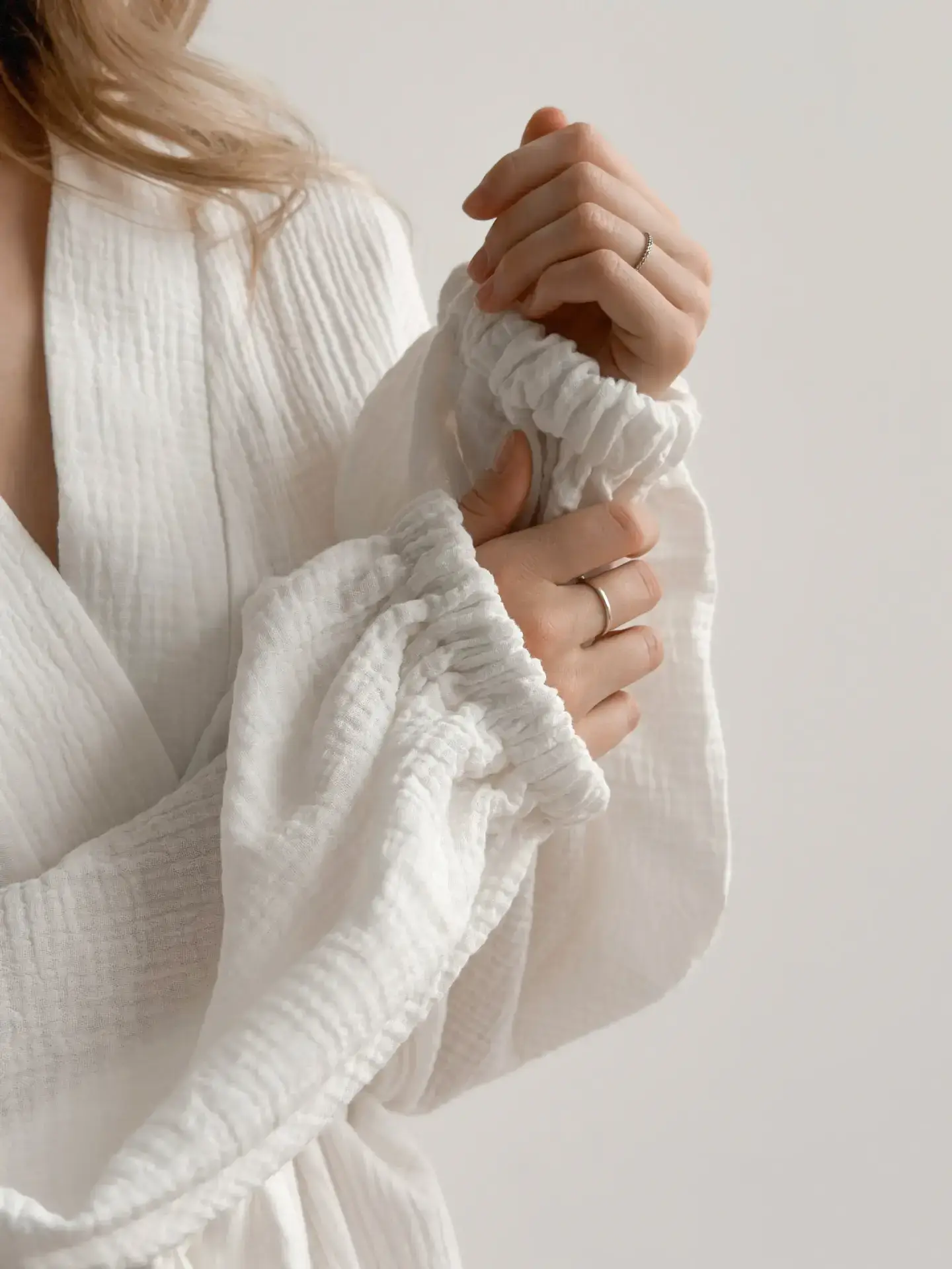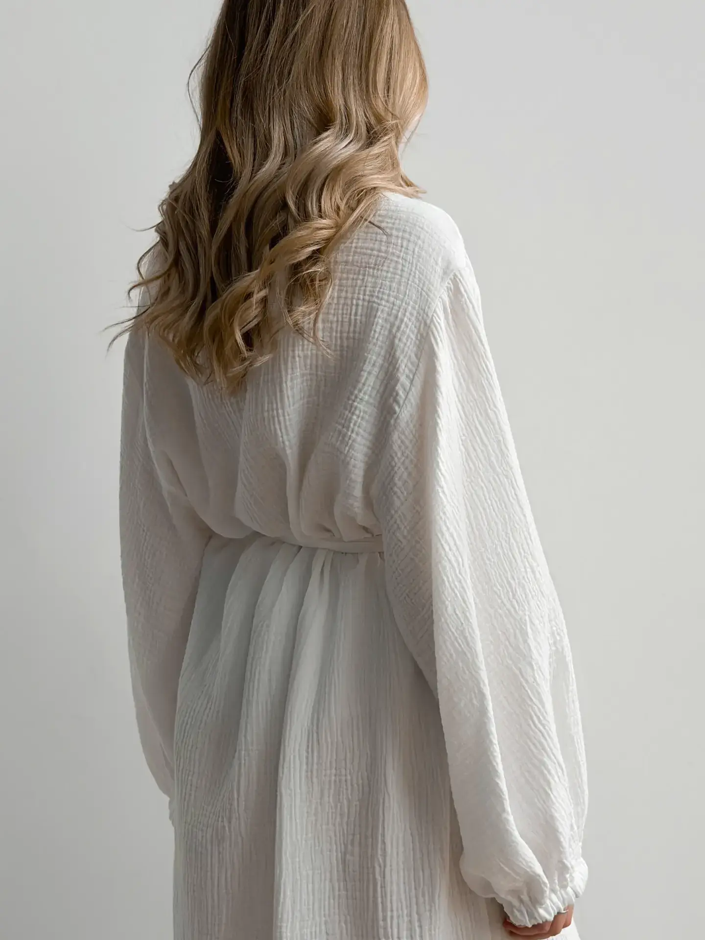 Długi szlafrok z muślinu zapewnia komfort i lekkość podczas codziennego noszenia. Naturalna, oddychająca tkanina jest przyjemna dla ciała i daje poczucie wygody. Prosty, stonowany fason sprawdzi się w domu, podczas wypoczynku lub letnich wyjazdów.