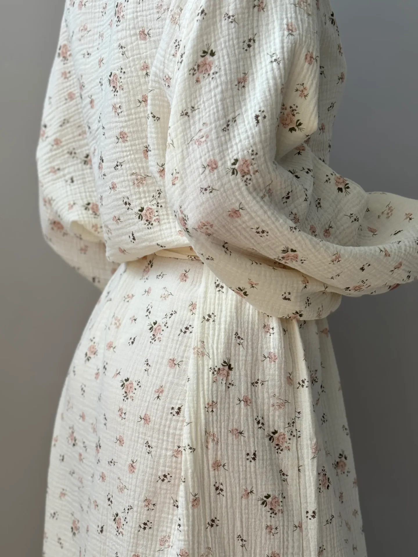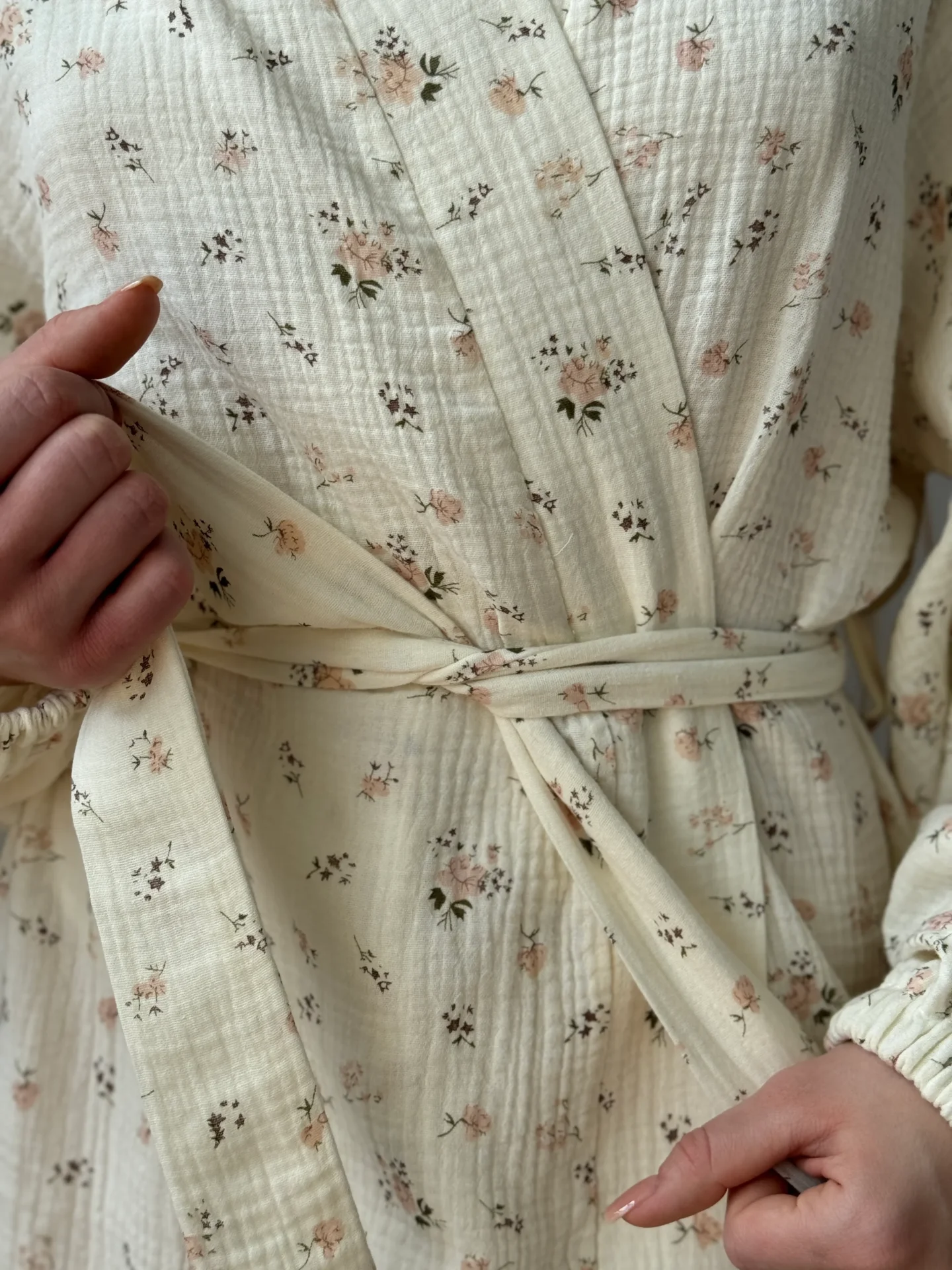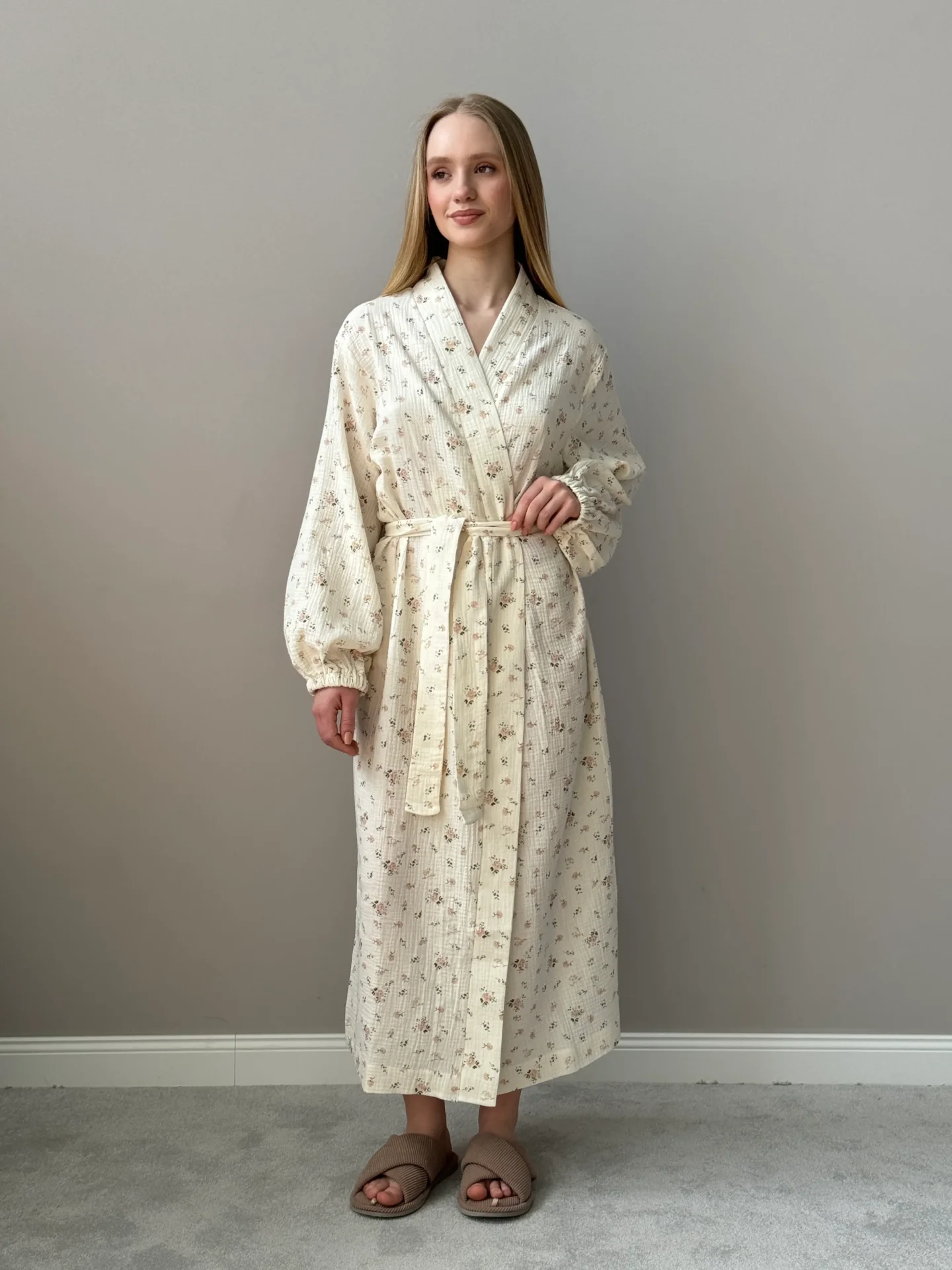 Szlafrok długi z muślinu, kremowy w brązowe róże