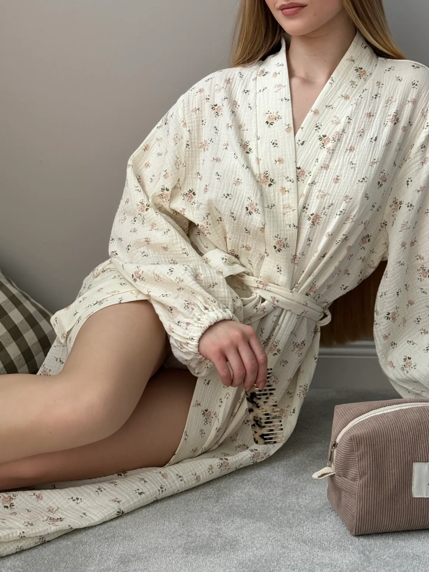 Długi szlafrok z muślinu zapewnia komfort i lekkość podczas codziennego noszenia. Naturalna, oddychająca tkanina jest przyjemna dla ciała i daje poczucie wygody. Prosty, stonowany fason sprawdzi się w domu, podczas wypoczynku lub letnich wyjazdów.