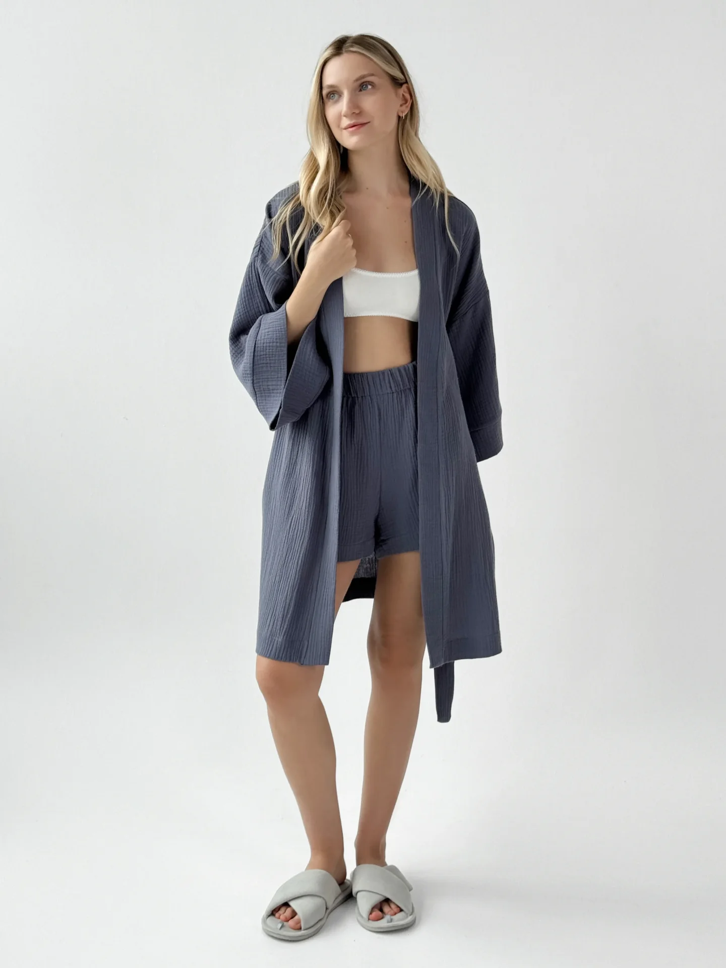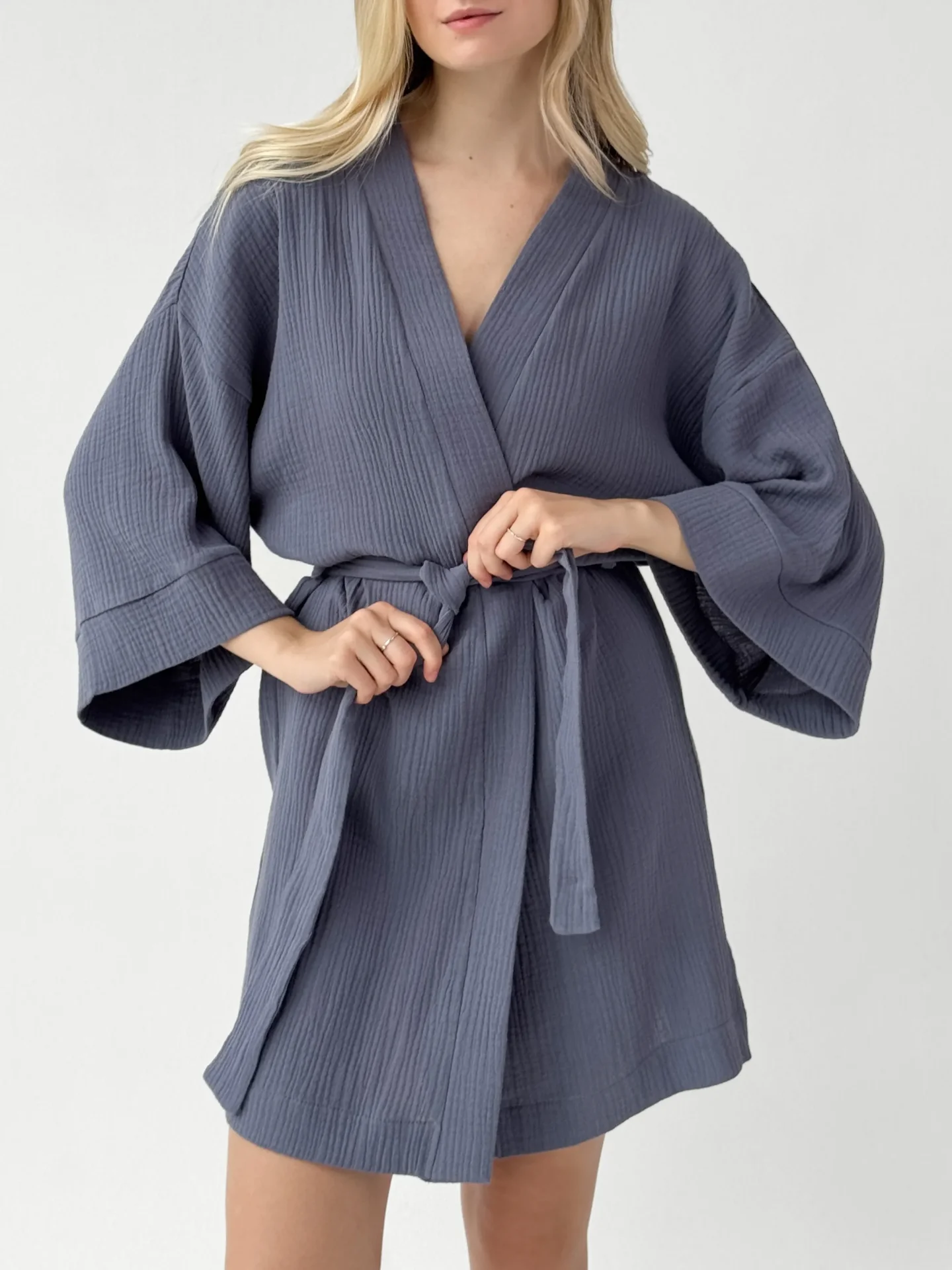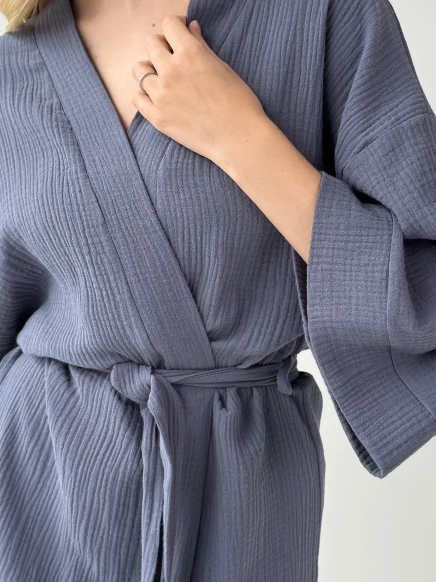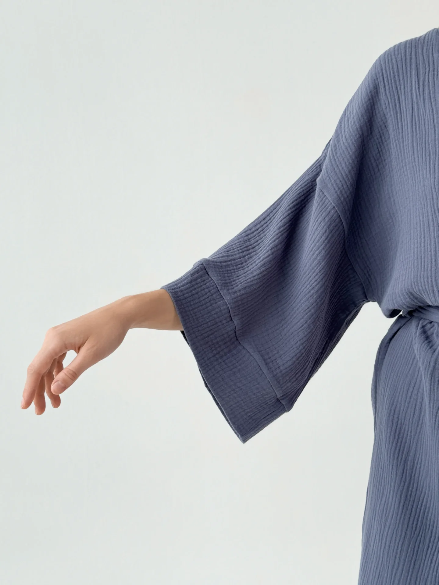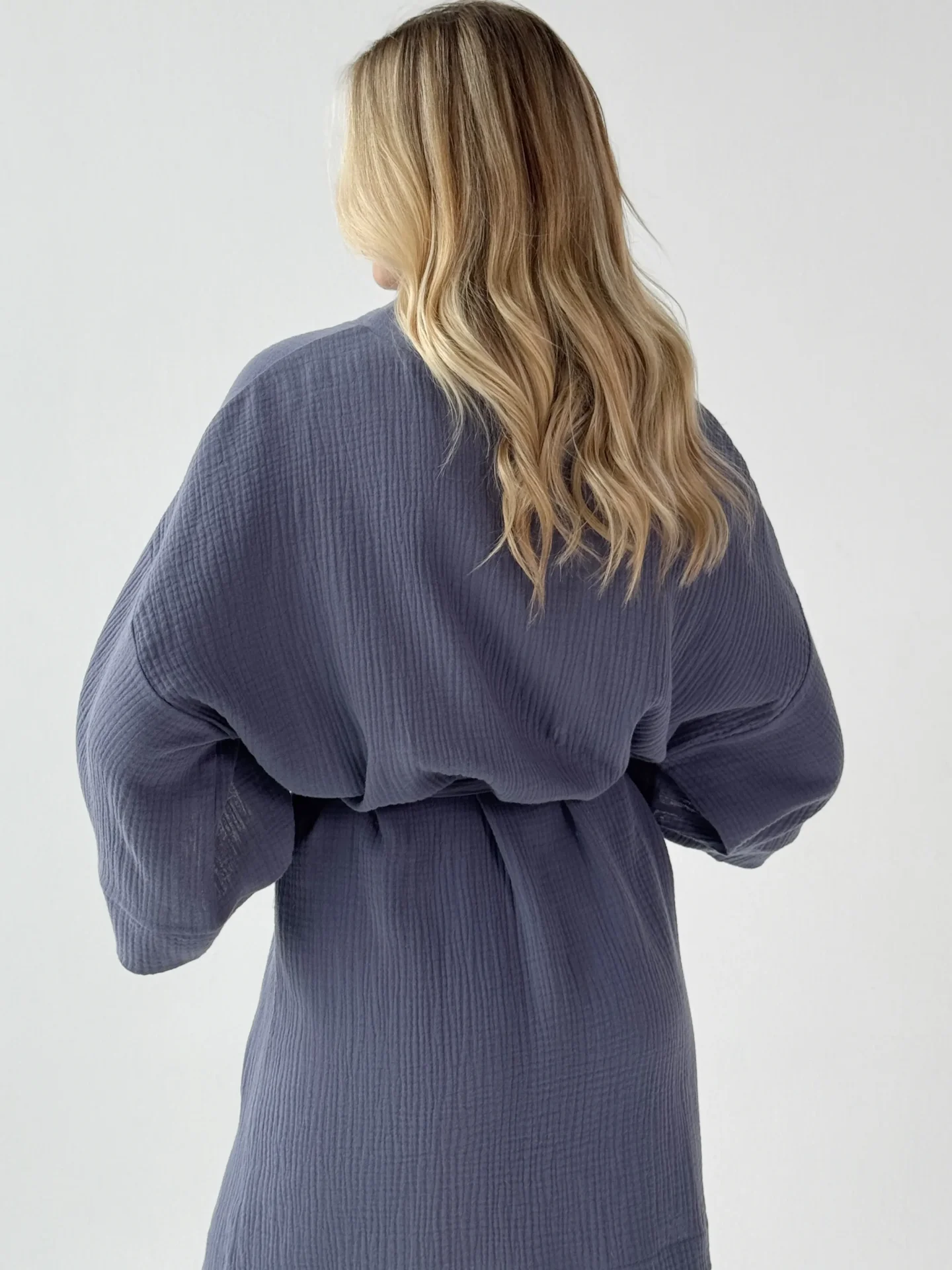 Szlafrok kimono z muślinu stworzony z myślą o lekkości i komforcie noszenia. Naturalny materiał jest przyjemny w dotyku i dobrze przepuszcza powietrze, dzięki czemu idealnie nadaje się do domu i na wypoczynek. Luźny krój zapewnia swobodę ruchów i swobodny styl.