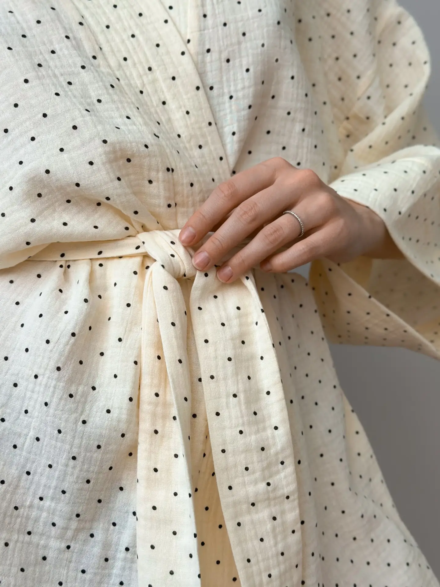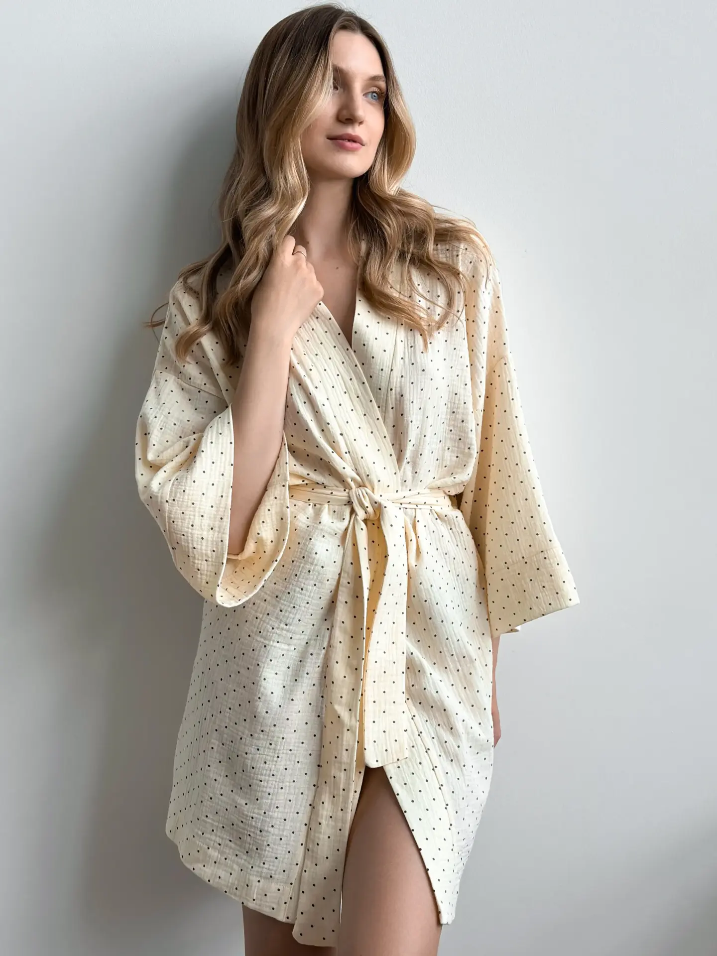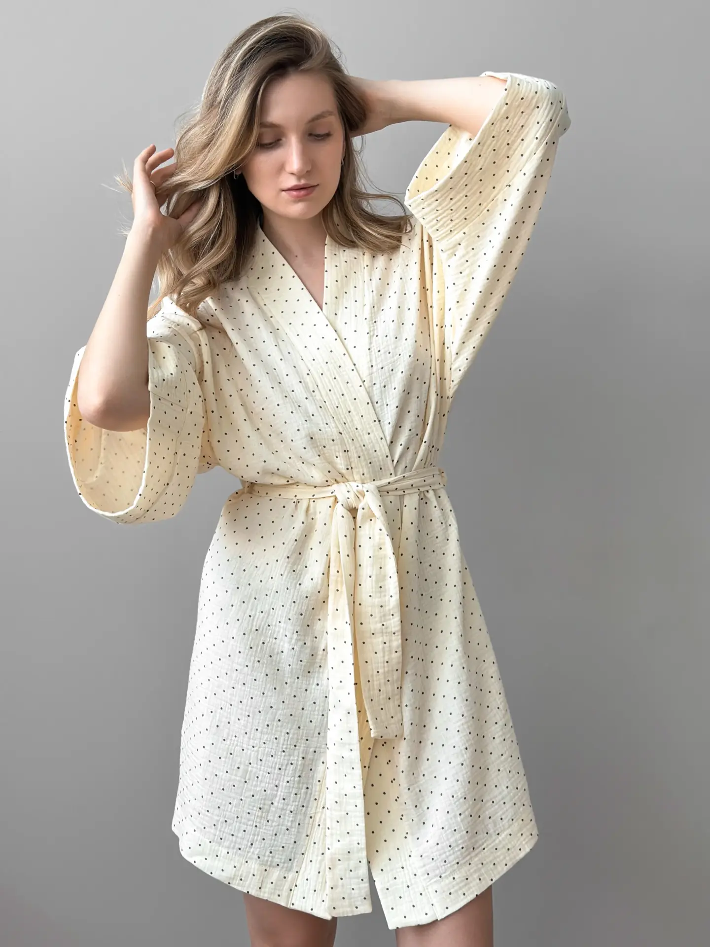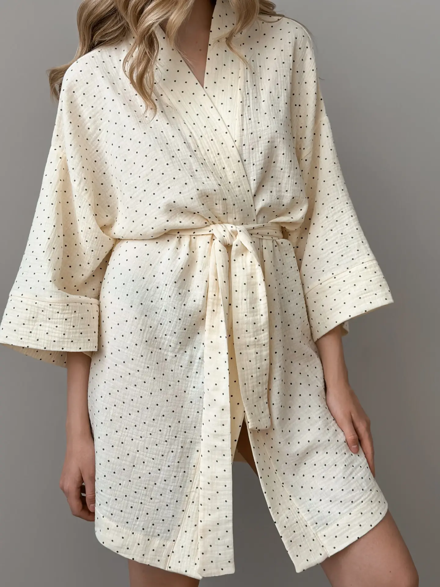 Szlafrok krótki kimono z muślinu, kremowy w groszki
