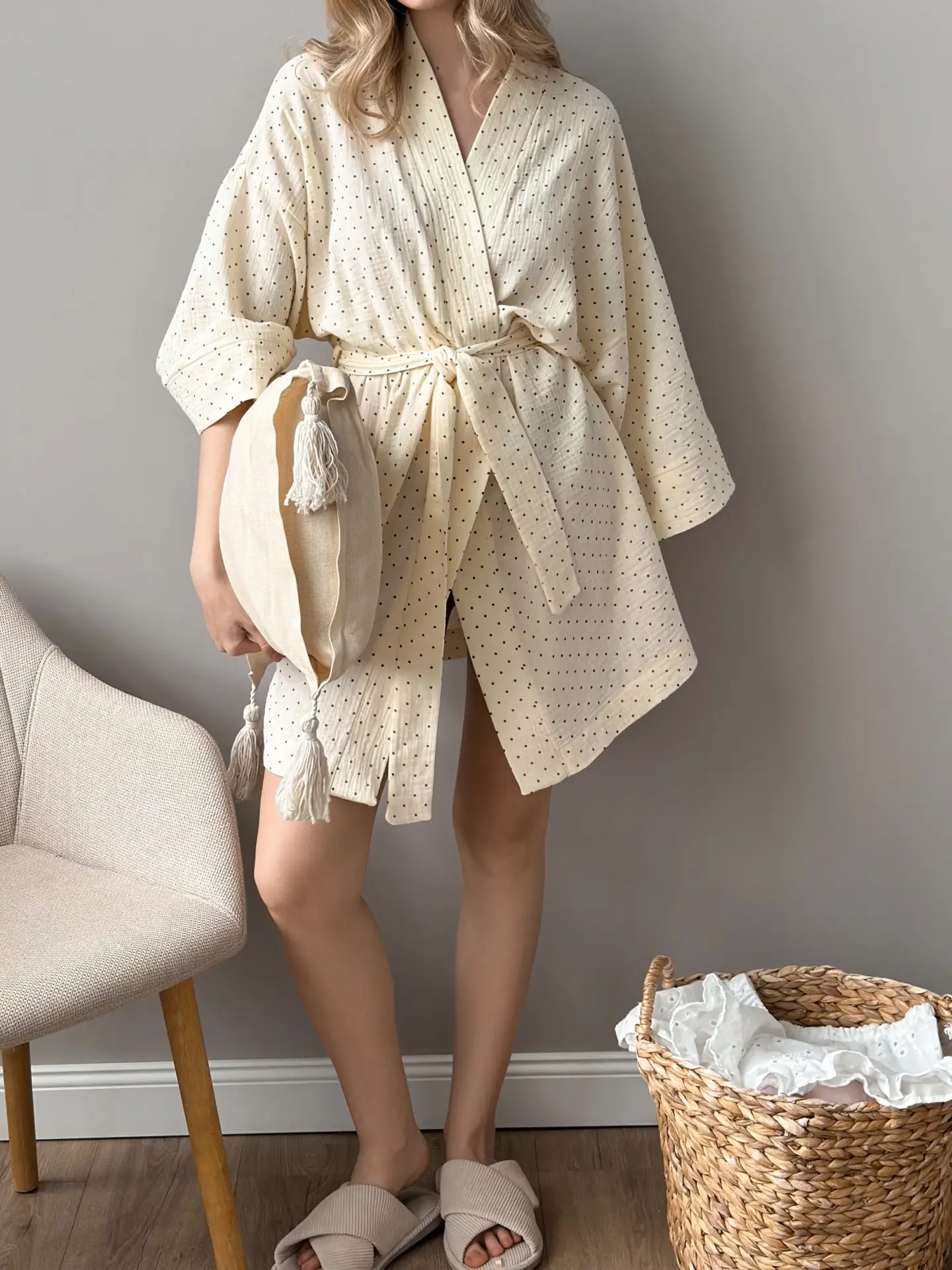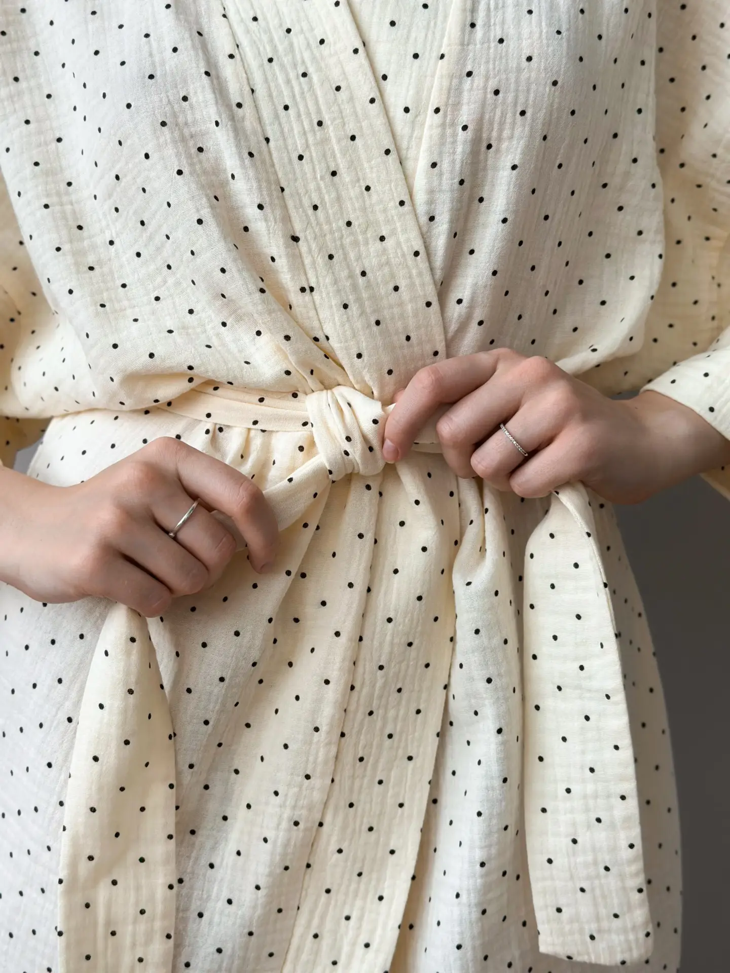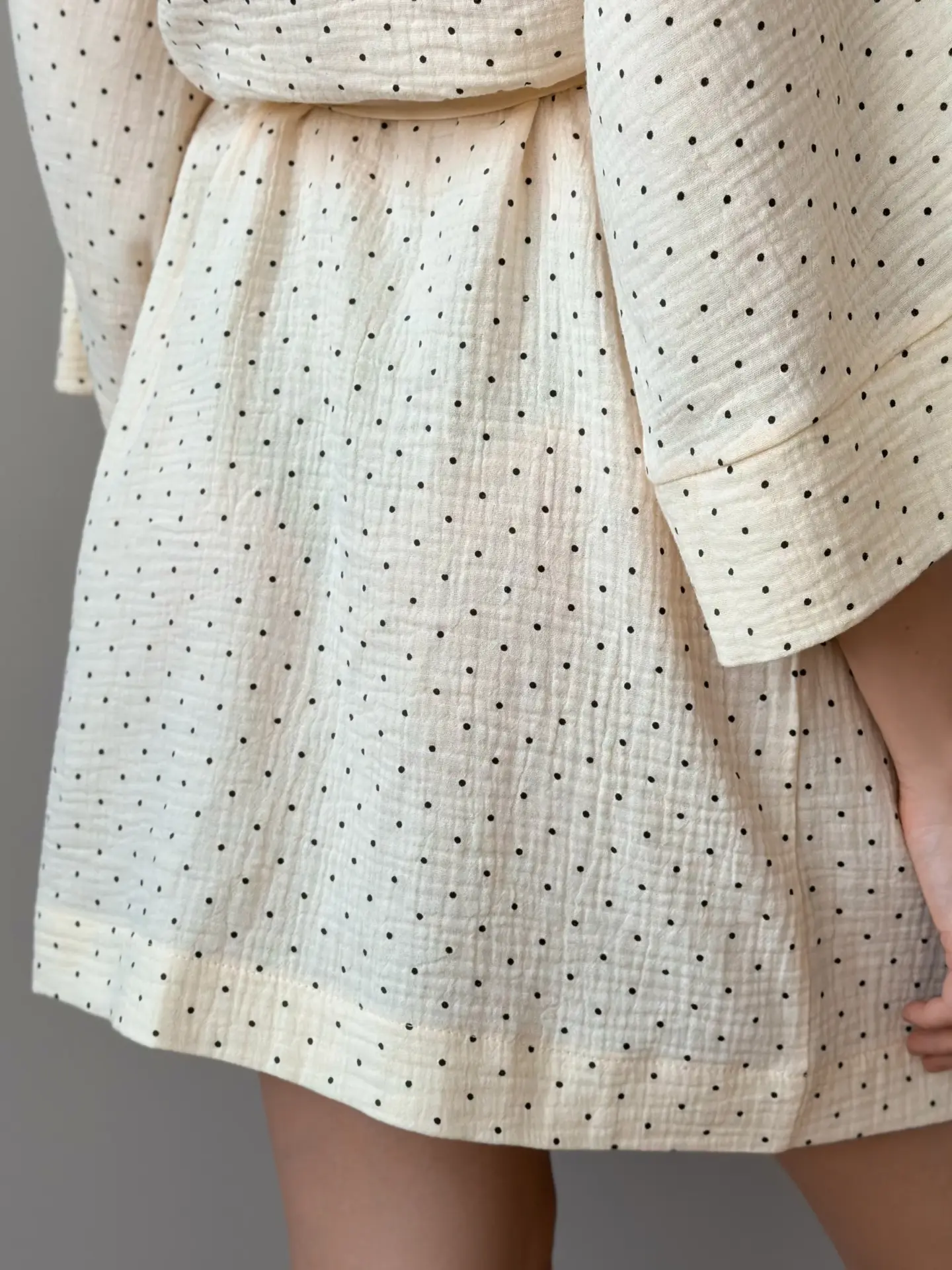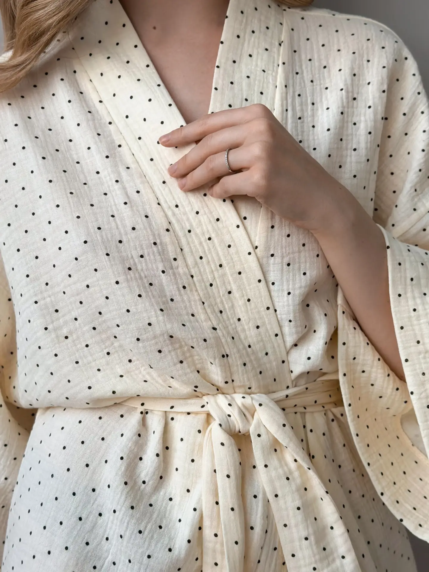 Szlafrok krótki kimono z muślinu, kremowy w groszki
