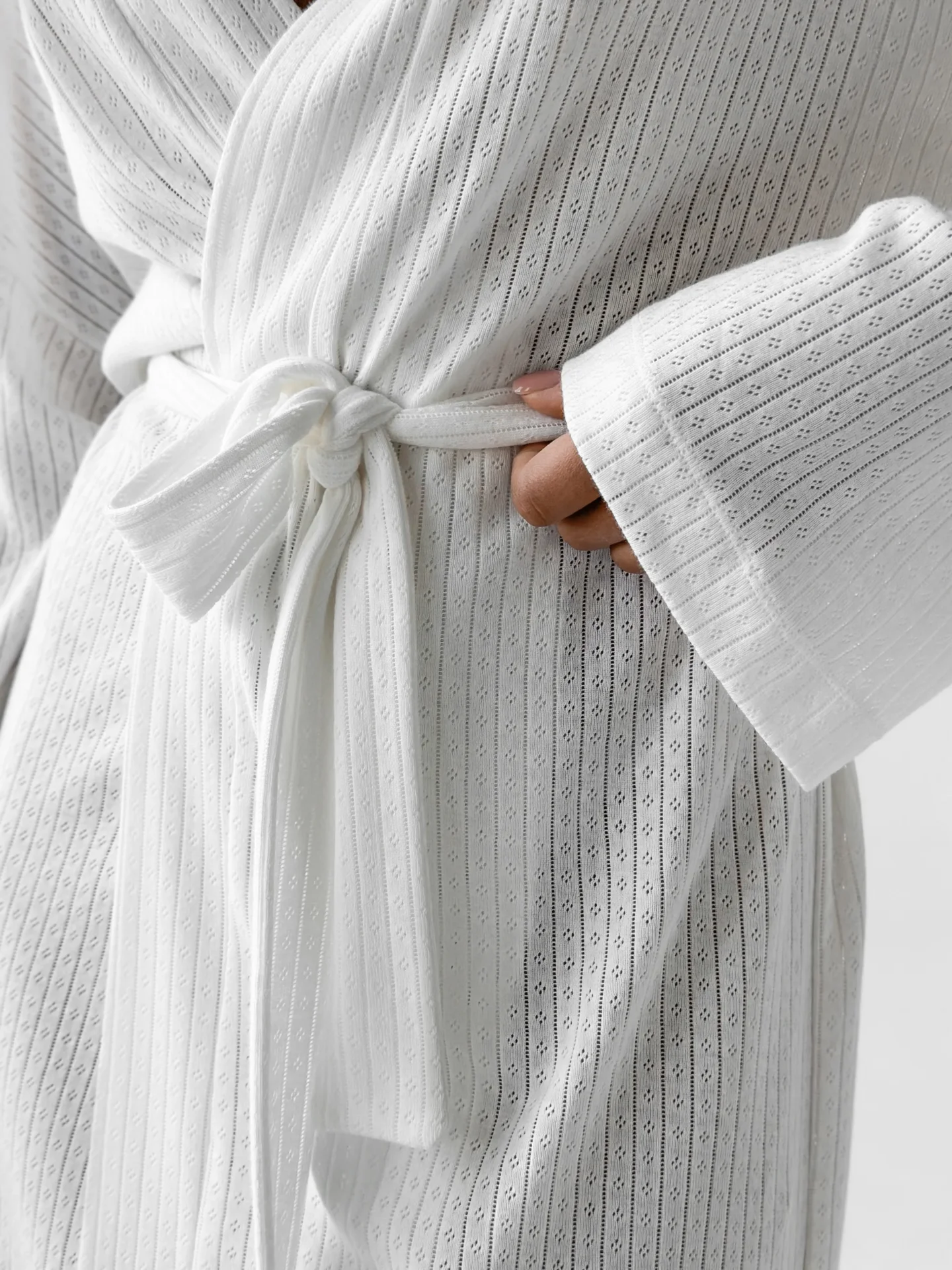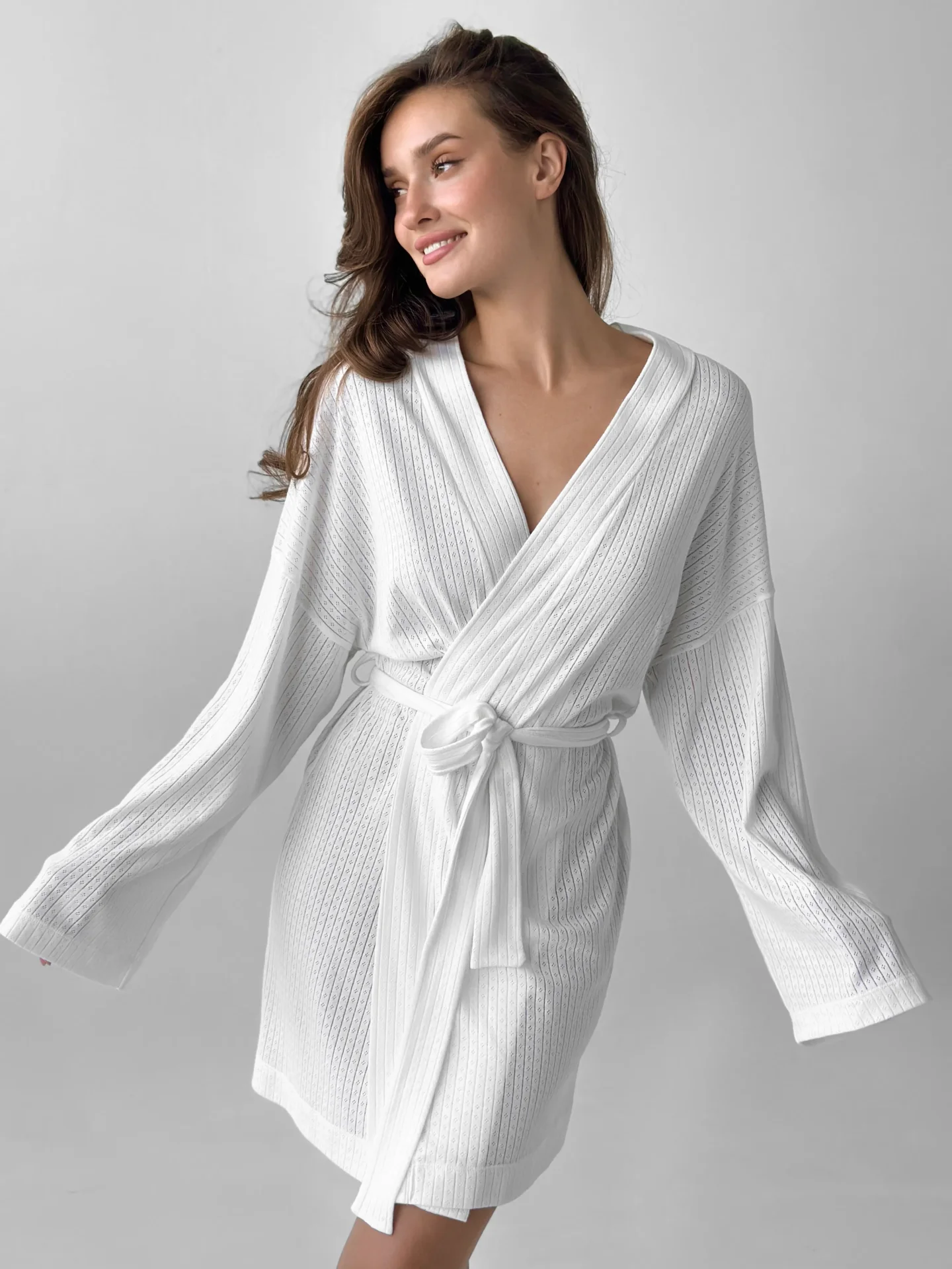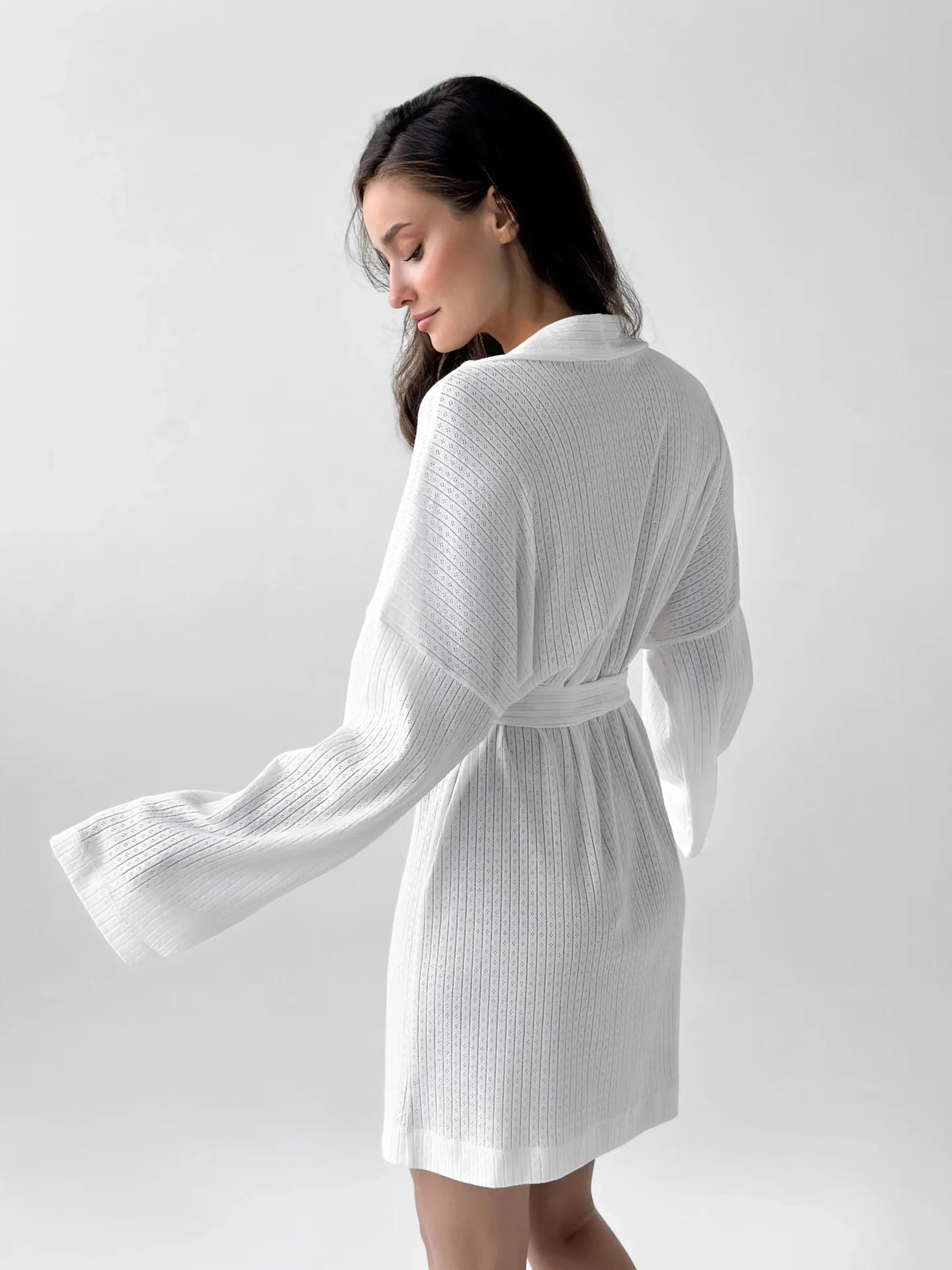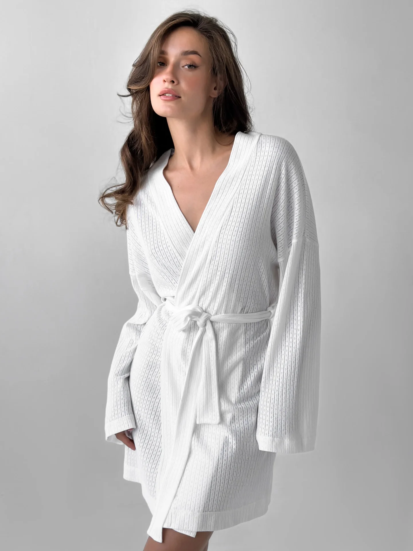 Szlafrok z ribany łączy w sobie miękkość i wygodę do codziennego noszenia. Elastyczna dzianina jest przyjemna dla ciała i zapewnia swobodę ruchów. Delikatny odcień nadaje stylizacji spokój i przytulność.