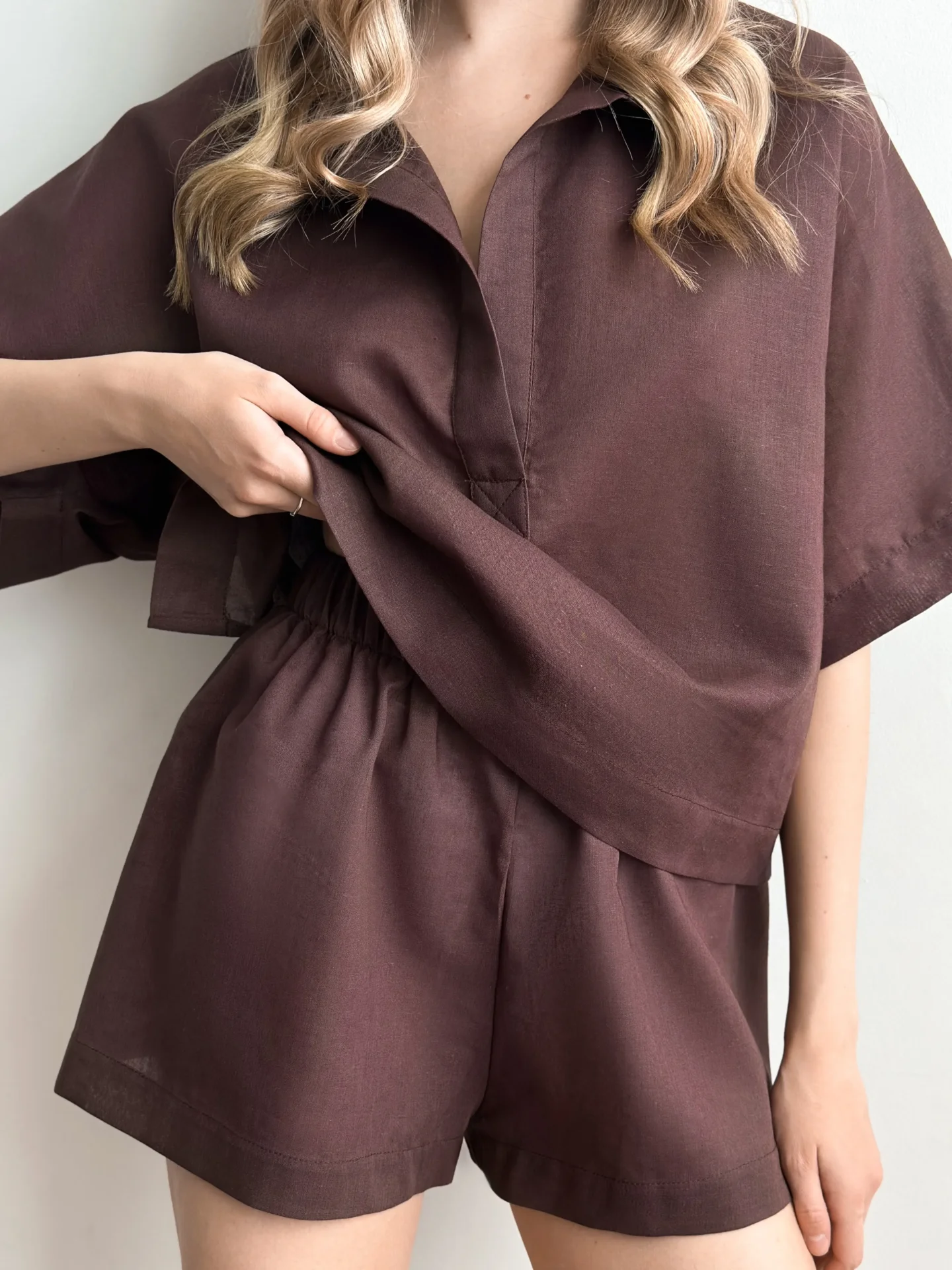 Szorty Mono z naturalnego lnu stworzone na lekkie, letnie stylizacje. Tkanina dobrze oddycha, jest przyjemna w dotyku i zapewnia komfort w upalne dni. Luźny krój daje swobodę ruchu, a minimalistyczny design sprawia, że model jest uniwersalny do codziennego noszenia, odpoczynku i podróży.