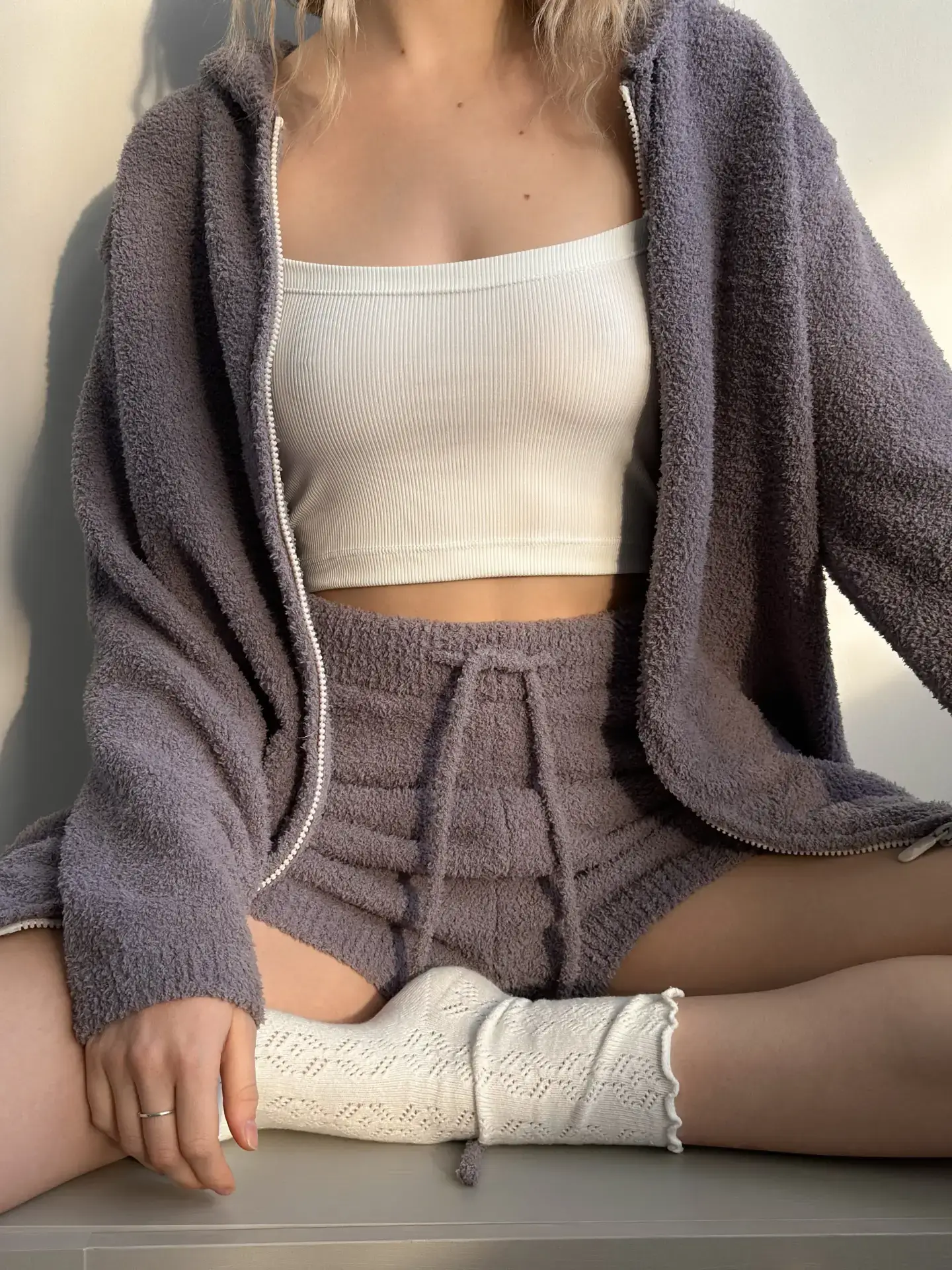 Miękkie dziane szorty z wysokim stanem. Przyjemny w dotyku materiał zapewnia komfort i wygodę. Idealne do domowego relaksu lub stylowych codziennych stylizacji.