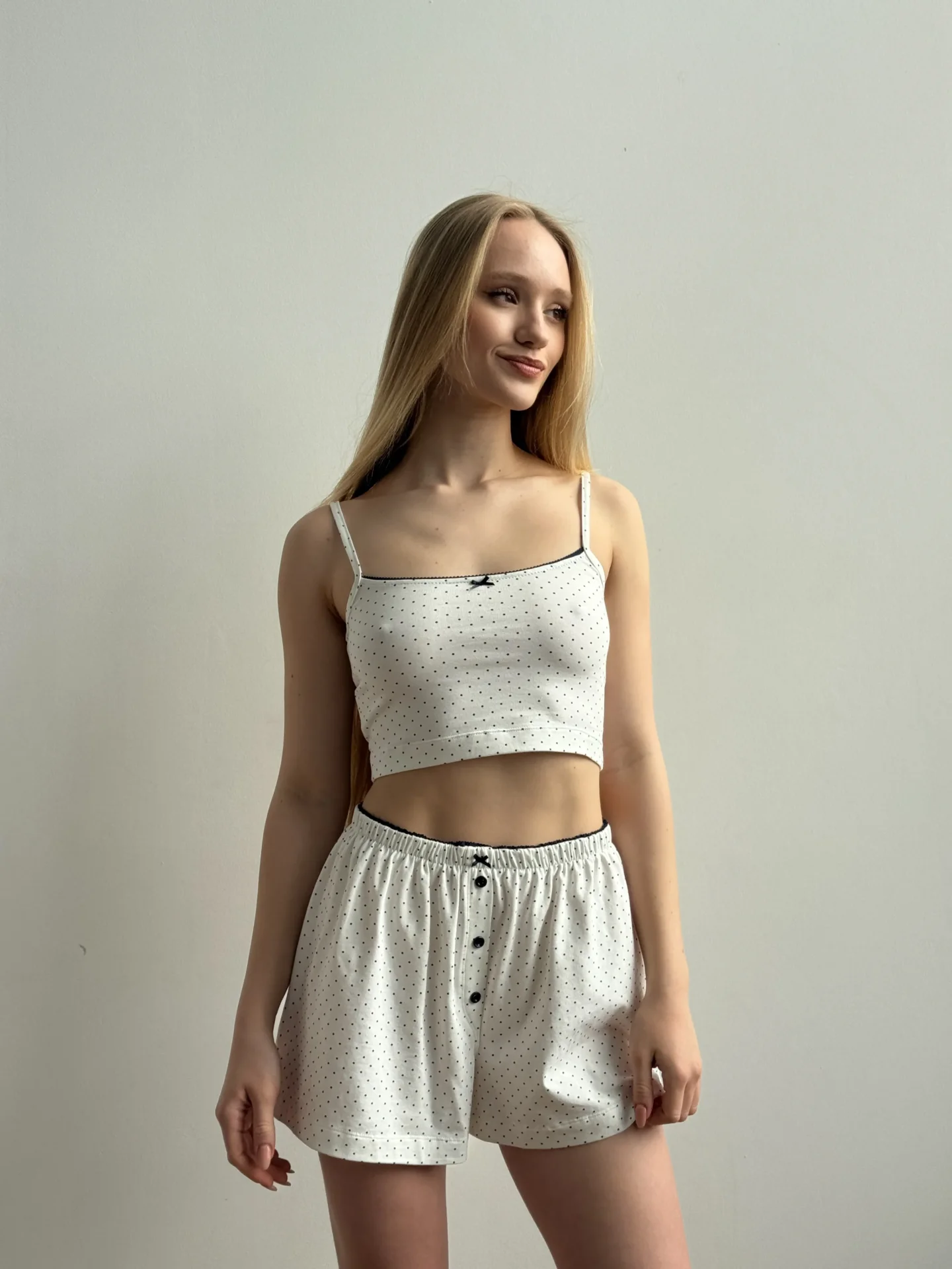 Szorty dzianinowe są lekkie i wygodne. Dzięki elastycznej tkaninie i luźnemu krojowi zapewniają wygodę noszenia, a ozdobna lamówka z guzikami dodaje im elegancji. Idealny wybór do domu lub jako część stylowego zestawu na co dzień.