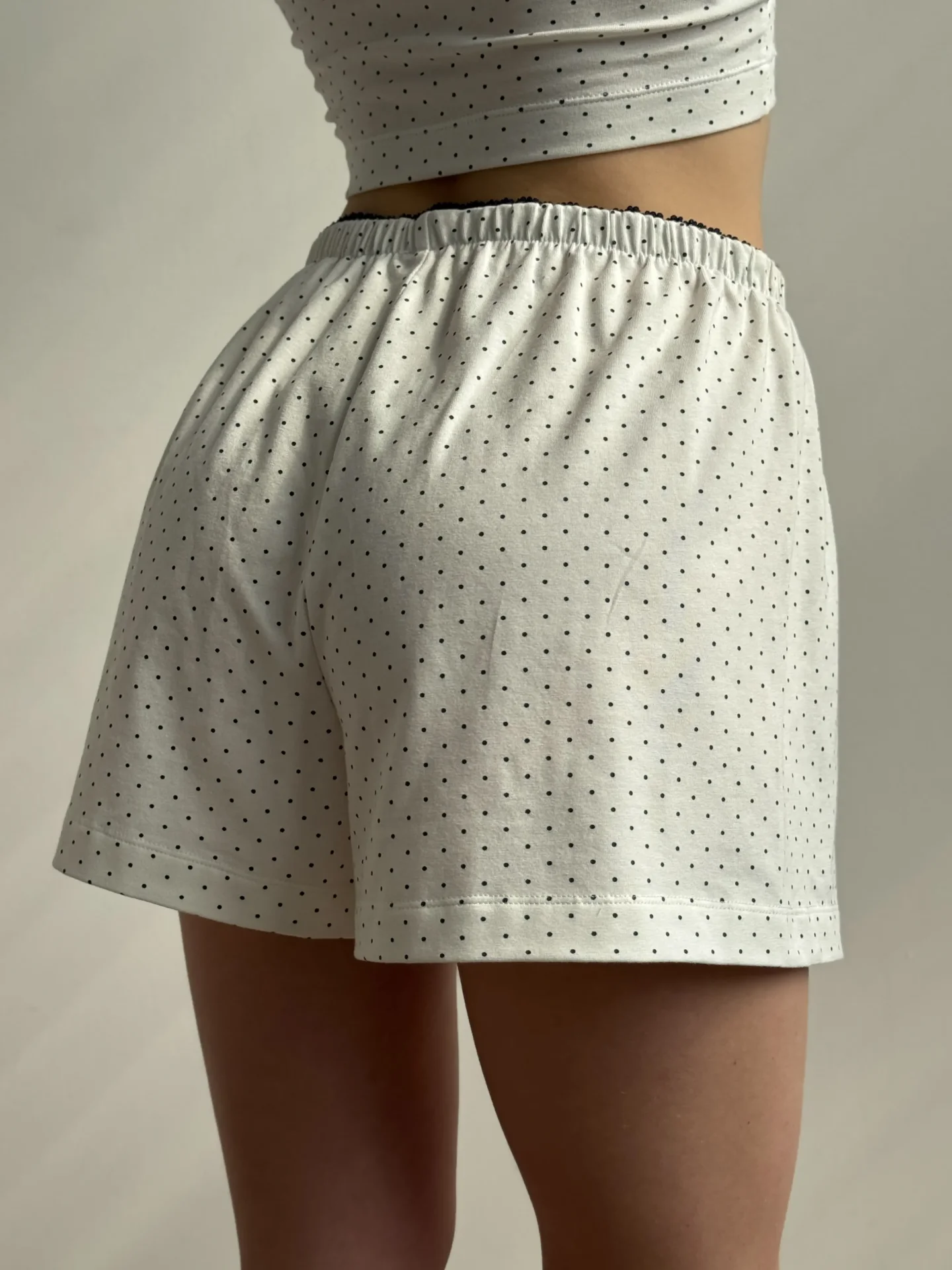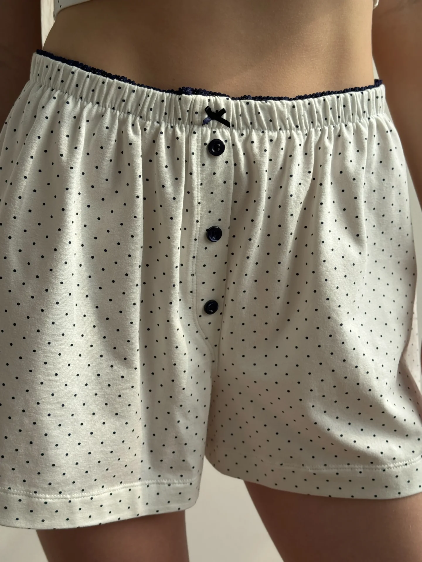 Szorty z rozporkiem ozdobnym, z dzianiny, białe w granatowe groszki