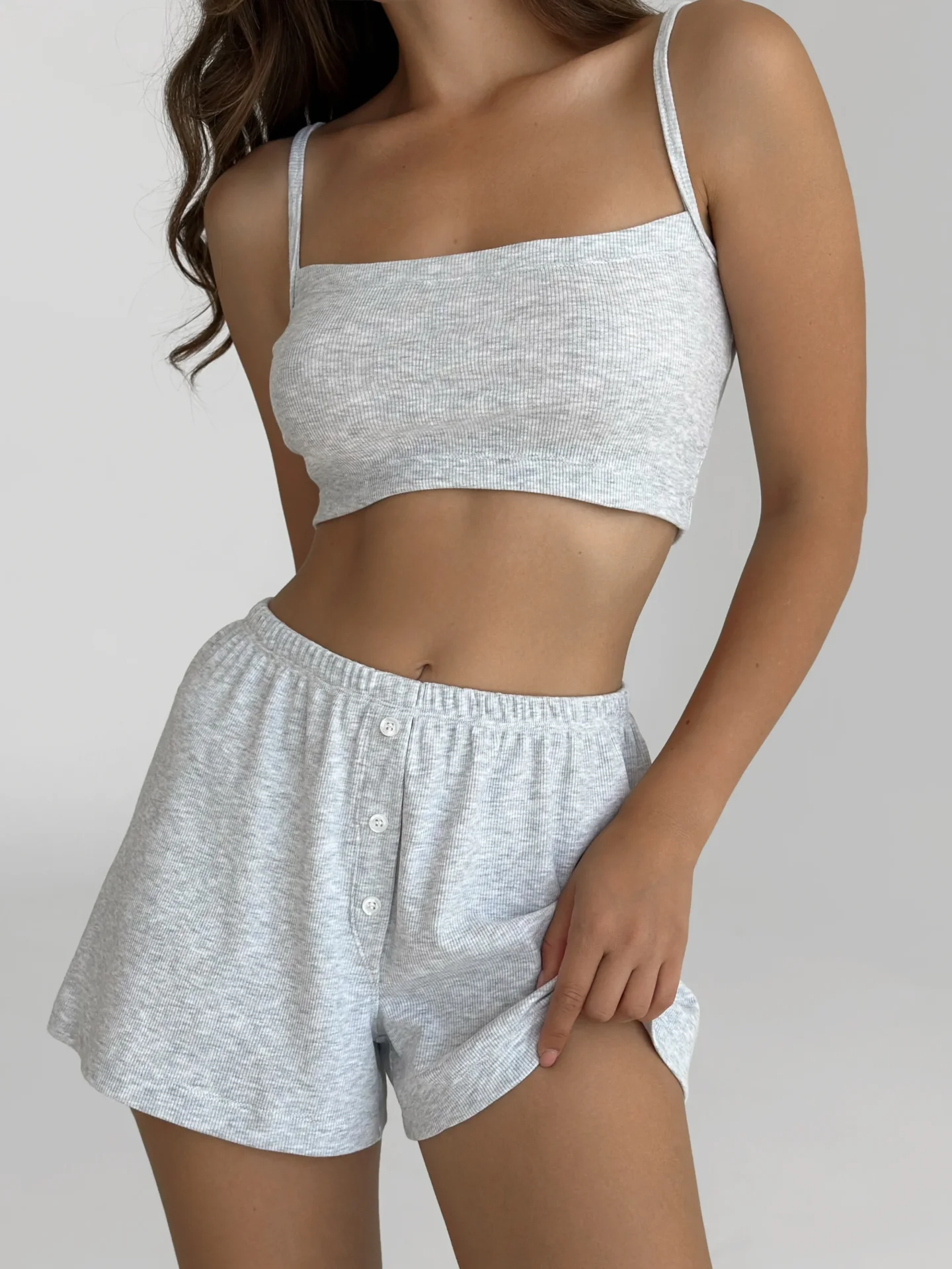 Szorty z prążkowanej dzianiny z wygodnym rozporkiem łączą komfort i praktyczność. Miękki, elastyczny materiał zapewnia swobodę ruchów i super wygodę na co dzień. Prosty, czysty design sprawia, że to uniwersalna opcja do domu i na pełen luz odpoczynku.