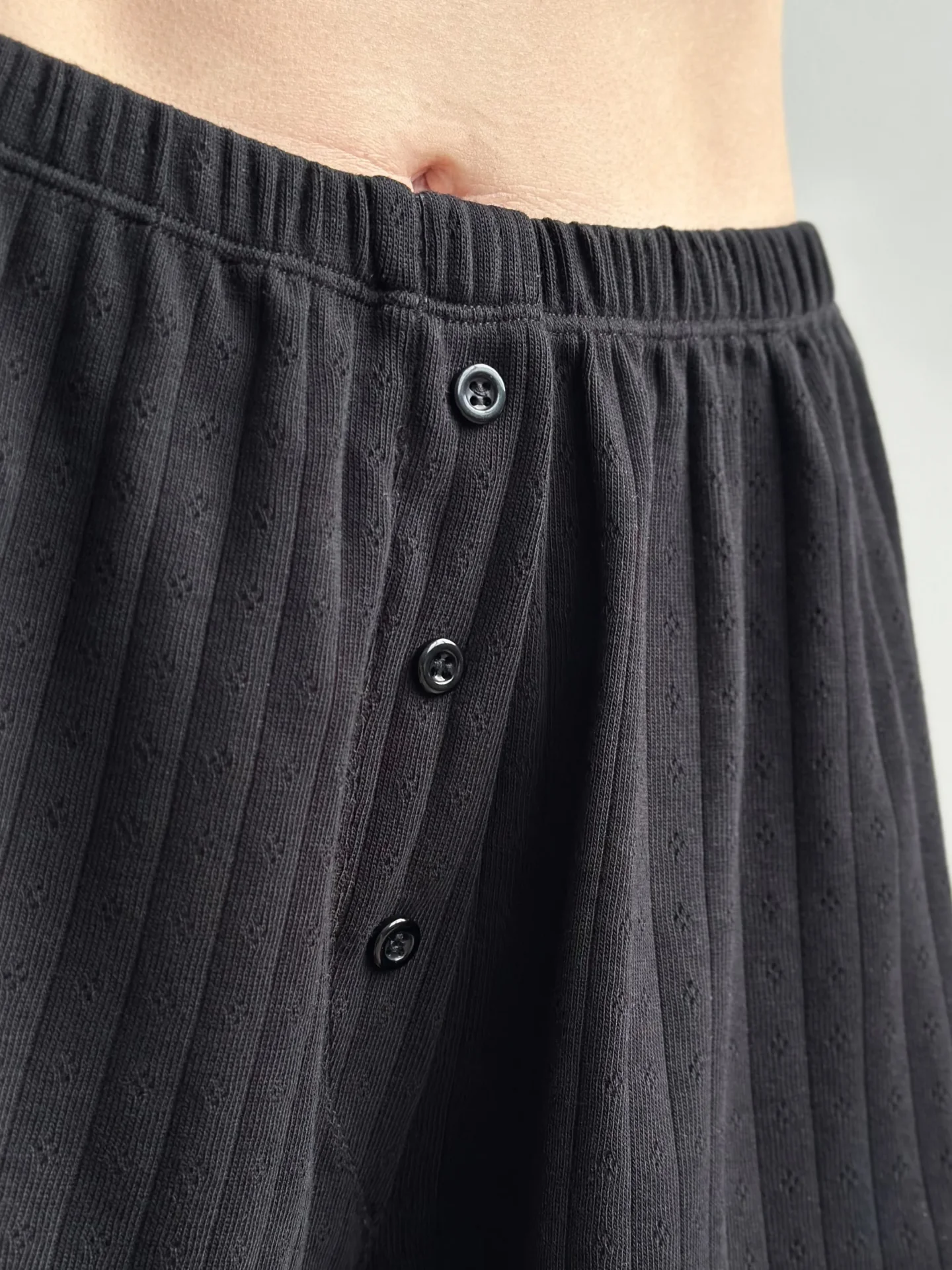 Szorty z ribany z rozporem łączą wygodę i elastyczność. Miękka dzianina dobrze się rozciąga, jest przyjemna w dotyku i nie krępuje ruchów. Idealny wybór do domowej garderoby lub na wypoczynek.